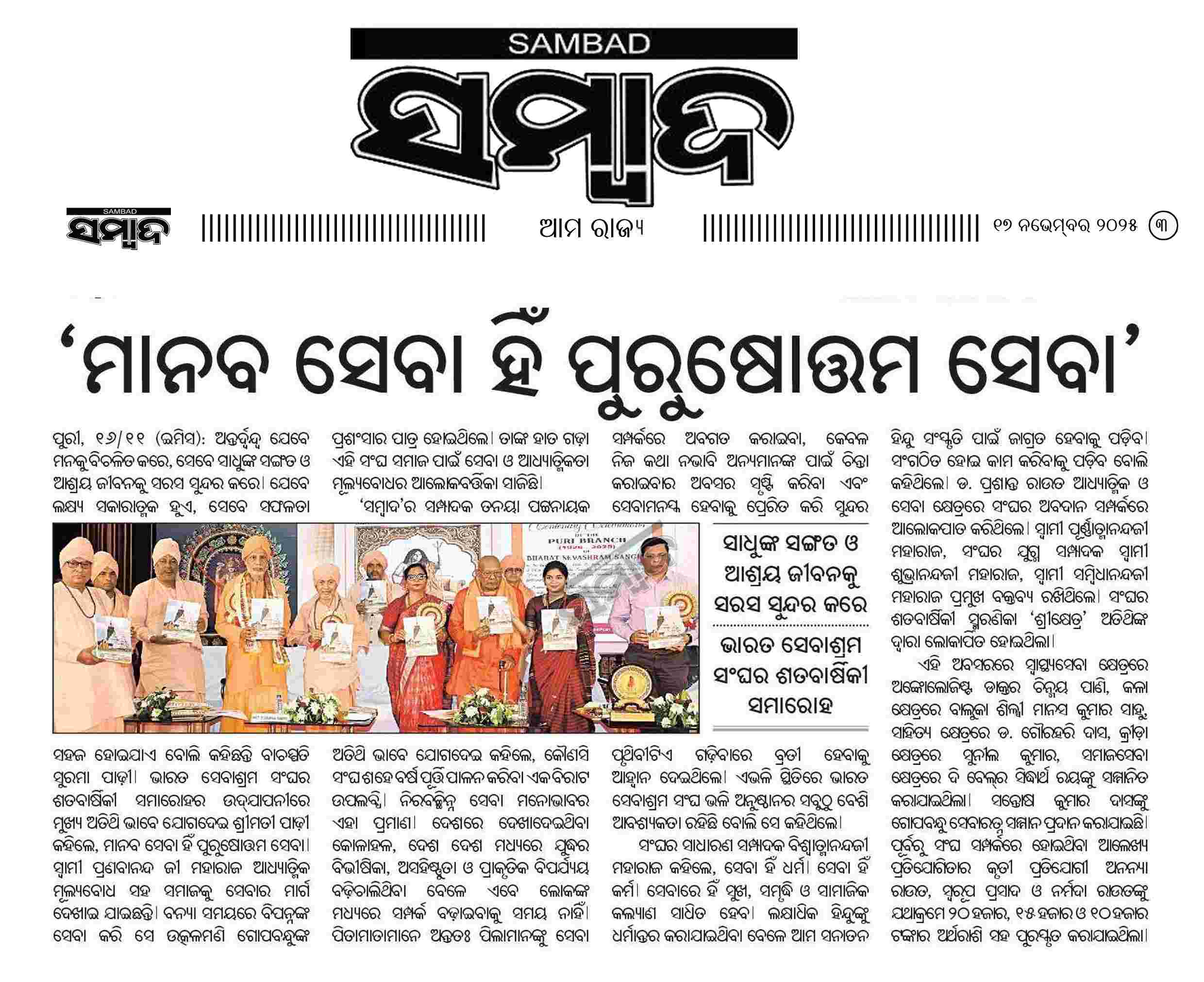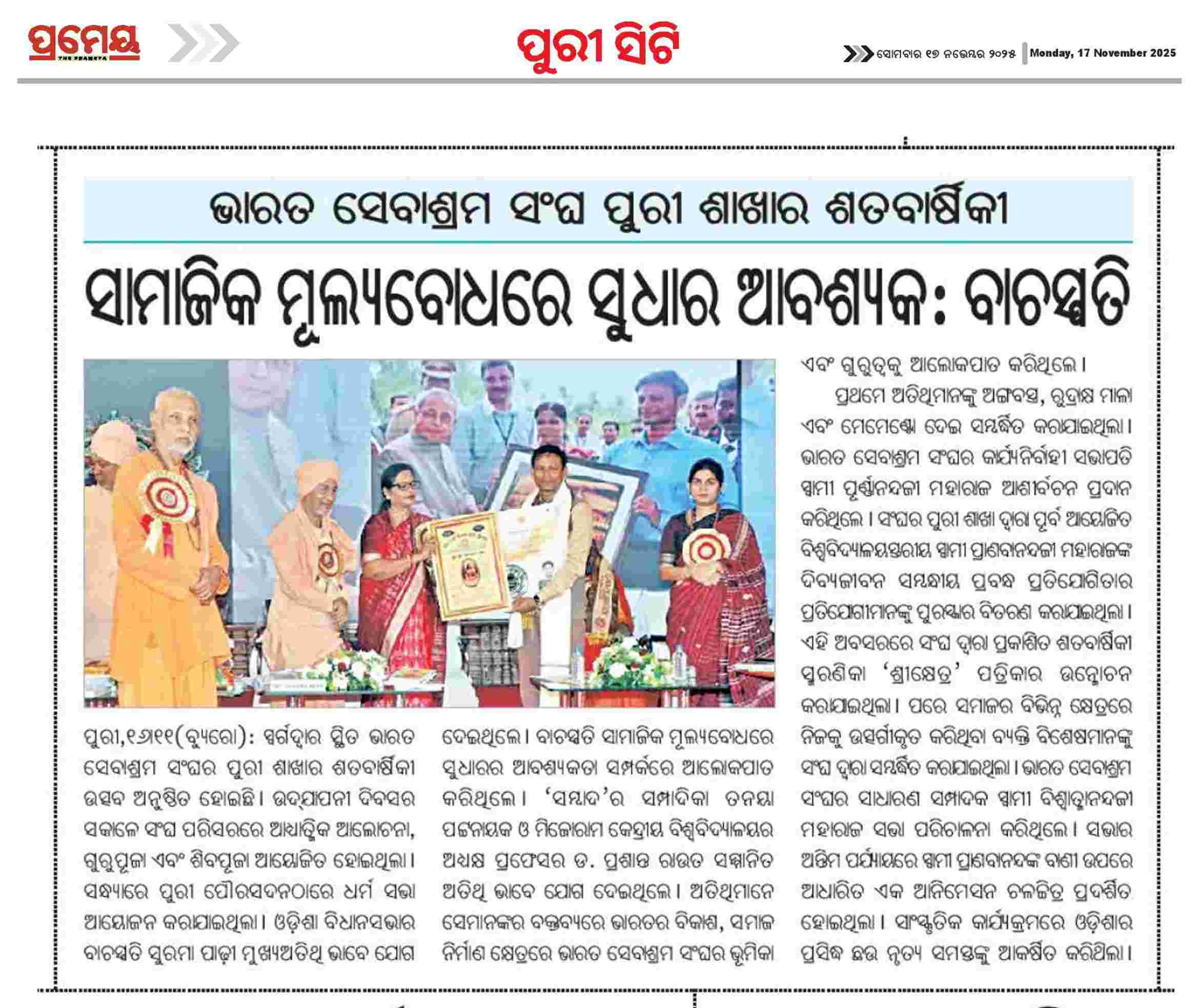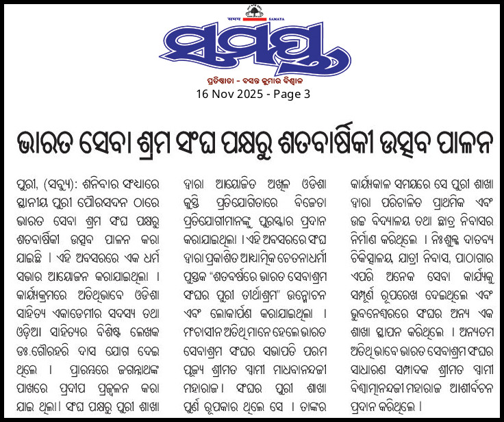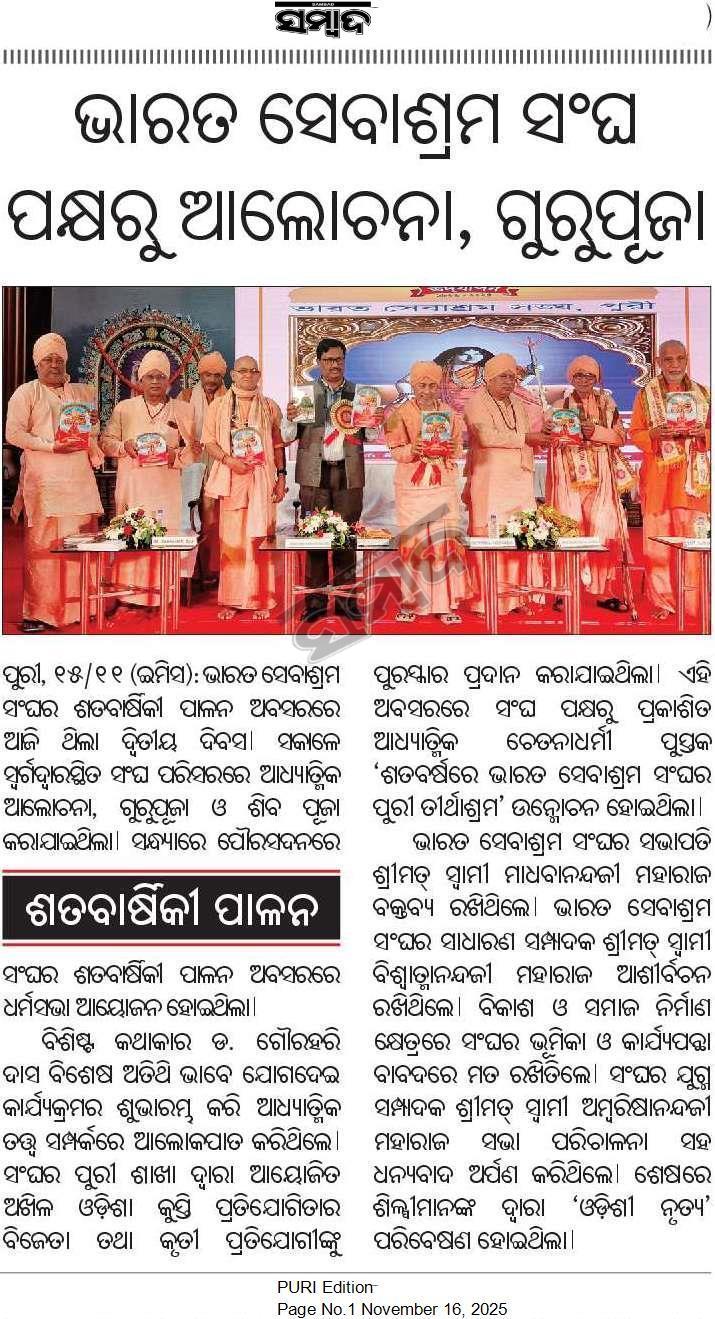 Puri branch of Bharat Sevashram Sangha is celebrating its 100 years of service to humanity : Prize distribution